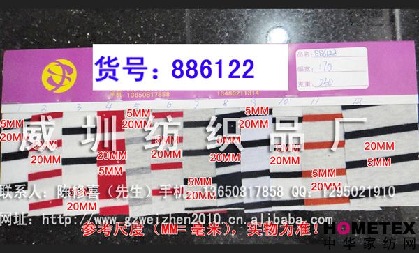 織物組織:色織 幅寬:170 密度:240T 貨號:886122 具體用途:襯衫、休閑服、棉服、褲裝、內衣、睡衣、時(shí)裝 別名:886122 成分及含量:滌棉 主要用途:服裝用布 紗支:32 ============================================================= 以上產(chǎn)品全部現貨供應,可隨時(shí)提供樣布卡和現貨,隨時(shí)發(fā)貨。所有產(chǎn)品全部是廠(chǎng)家直銷(xiāo)價(jià),我們承諾:以超低利潤營(yíng)銷(xiāo),我們只求銷(xiāo)售量。為保證您的利益,我司建議您在采購前先確認我們的品質(zhì)樣與顏色樣后再拿大貨,期待與您的真誠合作。因產(chǎn)品種類(lèi)較多,具體參考未盡詳盡,如有需要,請您與我們聯(lián)系。 瑞豐紡織(中大旗艦店)坐落于國內最大的紡織面料產(chǎn)業(yè)中心—廣州中大,是一家專(zhuān)業(yè)銷(xiāo)售面料的廠(chǎng)家直銷(xiāo)商。主要經(jīng)營(yíng)產(chǎn)品有:全棉凈色、仿記憶絲面料、全棉(TC)色織等,面料品種花達上千余種,所有產(chǎn)品全部現貨經(jīng)營(yíng)。 我們面料的品質(zhì)來(lái)源于:1、采用國內外優(yōu)質(zhì)的原材料;2、使用精良的生產(chǎn)工藝和設備;3、完善的生產(chǎn)質(zhì)量管理體系。我們具有開(kāi)發(fā)和創(chuàng )新品種的強烈意識和優(yōu)越條件,并根據客戶(hù)需求與市場(chǎng)變化時(shí)時(shí)推出潮流面料。憑著(zhù)多年的專(zhuān)業(yè)行業(yè)經(jīng)驗,根據客戶(hù)需求,不論客戶(hù)在全國任何地方,只要提供小樣,就可在一兩天時(shí)間內輕松獲得所需面料的信息。 批發(fā)說(shuō)明供應商支持混批 。 ============================================================= 有意請加QQ:1295021910或電話(huà)聯(lián)系。 公司名稱(chēng):威圳紡織品廠(chǎng) 聯(lián)系人:陳修喜先生 手機:13650817858 網(wǎng)址:http://www.gzweizhen2010.cn.alibaba.com =============================================================