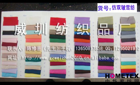 織物組織:平紋 幅寬:150cm 品名:雪紡 密度:121*96 染整工藝:染色 貨號:6003 具體用途:休閑服、棉服、褲裝、時(shí)裝 別名:6003 成分及含量:100%滌綸 主要用途:服裝用布 紗支:20D+26D ============================================================= 以上產(chǎn)品全部現貨供應,可隨時(shí)提供樣布卡和現貨,隨時(shí)發(fā)貨。所有產(chǎn)品全部是廠(chǎng)家直銷(xiāo)價(jià),我們承諾:以超低利潤營(yíng)銷(xiāo),我們只求銷(xiāo)售量。為保證您的利益,我司建議您在采購前先確認我們的品質(zhì)樣與顏色樣后再拿大貨,期待與您的真誠合作。因產(chǎn)品種類(lèi)較多,具體參考未盡詳盡,如有需要,請您與我們聯(lián)系。 瑞豐紡織(中大旗艦店)坐落于國內最大的紡織面料產(chǎn)業(yè)中心—廣州中大,是一家專(zhuān)業(yè)銷(xiāo)售面料的廠(chǎng)家直銷(xiāo)商。主要經(jīng)營(yíng)產(chǎn)品有:全棉凈色、仿記憶絲面料、全棉(TC)色織等,面料品種花達上千余種,所有產(chǎn)品全部現貨經(jīng)營(yíng)。 我們面料的品質(zhì)來(lái)源于:1、采用國內外優(yōu)質(zhì)的原材料;2、使用精良的生產(chǎn)工藝和設備;3、完善的生產(chǎn)質(zhì)量管理體系。我們具有開(kāi)發(fā)和創(chuàng )新品種的強烈意識和優(yōu)越條件,并根據客戶(hù)需求與市場(chǎng)變化時(shí)時(shí)推出潮流面料。憑著(zhù)多年的專(zhuān)業(yè)行業(yè)經(jīng)驗,根據客戶(hù)需求,不論客戶(hù)在全國任何地方,只要提供小樣,就可在一兩天時(shí)間內輕松獲得所需面料的信息。 批發(fā)說(shuō)明供應商支持混批 。 ============================================================= 有意請加QQ:1295021910或電話(huà)聯(lián)系。 公司名稱(chēng):威圳紡織品廠(chǎng) 聯(lián)系人:陳修喜先生 手機:13650817858 網(wǎng)址:http://www.gzweizhen2010.cn.alibaba.com =============================================================